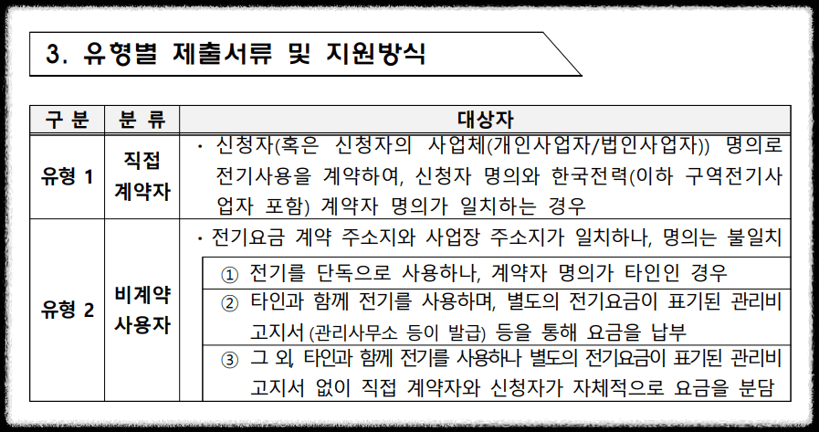 소상공인 전기요금 특별지원 제출서류는 대상자 유형에 따라 제출서류도 달라집니다.